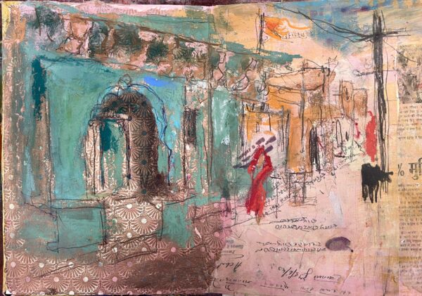 Today, I share these experiences with small groups of fellow creatives who travel to India with me. Together, we wander, sketch, and explore—capturing the extraordinary beauty we encounter: intricate doorways, tangled wires, faded posters, majestic motifs. Each of us falls in love with something different, and that’s what makes the creative journey so rich. Through mixed media and mark-making, we tell our stories together.