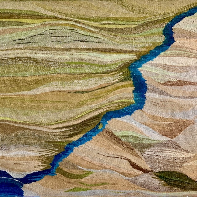 Ms. Strasen spent months studying the path of the mighty Columbia River. She scoured topographical maps, history, the people who lived along it, and its importance. She spent months at her loom weaving the story of the river, from headwaters in Canada to its termination into the Pacific Ocean. She marked dams along the way as the scars on the river and to the populace, the land as it changes from desert to lush forest, all while creating a breathtaking textile. She made individual weavings of many of the tributaries that give life to the communities along them.