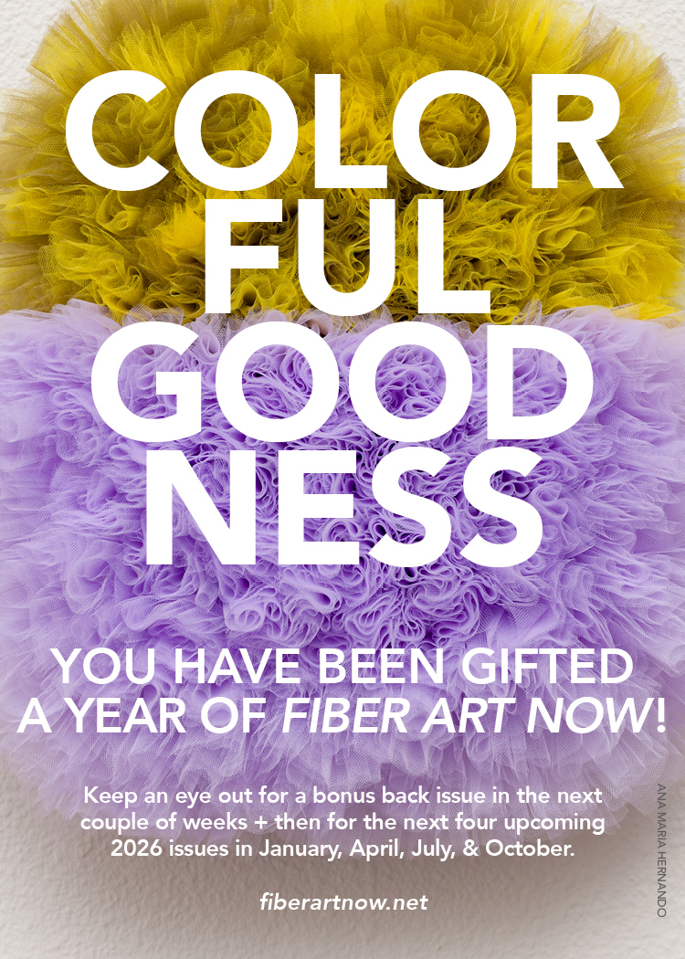 “Fiber Art Now reconnects me with an essential aspect of who I am. The ideas, inspiration, and all the rest pull me back to my core and reminds me to keep moving on with my practices. It’s easy to get distracted by life’s demands and obligations. Fiber Art Now is that centering word/intention that brings me back to the meditation and a measure of inner peace.”
